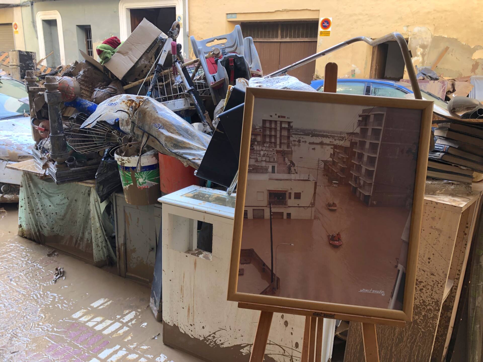 Foto de la Pantanà del 1982 amb els desperfectes de la dana darrere al carrer de Jovellanos d’Algemesí. Foto NP.