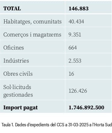 La setzena nota informativa del Consorci de Compensació d’Assegurances a 31-03-2025 diu que han rebut 245.388 sol·licituds d’indemnització (95,4 % de la província de València), de les quals n’han descartades 23.099 per duplicitat o falta de cobertura, i n’han pagades 184.696 per valor de 2.612 M€. Estima la sinistralitat en 4.500 M€ dels béns assegurats. Les dades per municipi amb més de 100 sol·licituds consten en l’annex a la nota, però els que afecten els 20 municipis de la comarca de l’Horta Sud es representen en la taula següent: