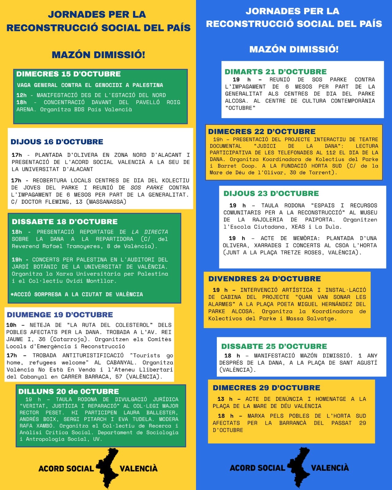La vaga general del 15 d’octubre s’emmarca en el calendari de les Jornades de l’Acord Social Valencià “Per la Reconstrucció Social del País”, que reuneixen col·lectius socials, culturals i ecologistes per denunciar les polítiques de reconstrucció de Mazón i Vox i proposar alternatives “centrades en la vida i no en el formigó”