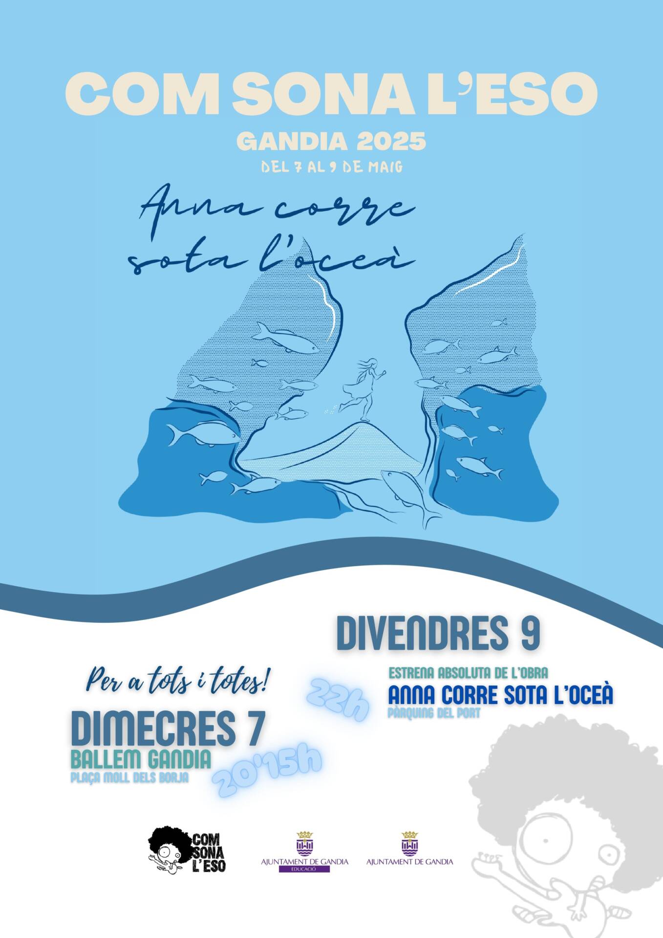El projecte pretén una interacció també amb la població, per això dimecres 7 a les 20 h es presentarà en el Moll dels Borja el Ballem Gandia, una proposta de danses del món assajades a classe, un acte on es convida tots els saforencs i visitants a unir-se al ball i compartir les danses. I divendres a la nit és la gran estrena de l’obra, el moment més esperat on es mostrarà el resultat de moltes hores de treball en què alumnat i professorat cantaran i tocaran junts i faran emocionar el públic amb la interpretació de cançons i coreografies que permeten endinsar-se en l’obra amb tots els sentits. Cada any el contingut i temàtica de l’obra és diferent, sempre amb un rerefons educatiu, des de la filosofia, la història, la tècnica, la creació i una especial atenció a la intel·ligència emocional, tan necessària en la formació de persones. Anna corre sota l’oceà és un exponent de les adversitats amb què ens trobem i que combatem cada dia, la necessitat de parar, de ser escoltats i de compartir totes les emocions que se’n desprenen. La nit del 9 de maig serà, sens dubte, una nit màgica que deixarà palesa la importància de l’educació artística en la formació de l’alumnat i la qualitat de l’escola pública, un esdeveniment únic que demostra el sentit del major projecte educatiu musical d’Europa.