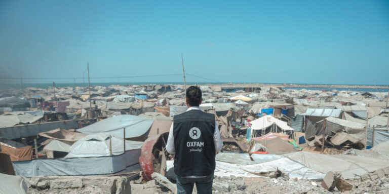 Un membre d’Oxfam Intermón camina entre tendes de campanya i runes a la ciutat de Gaza. Foto: Alef Multimedia/Oxfam Fa […]