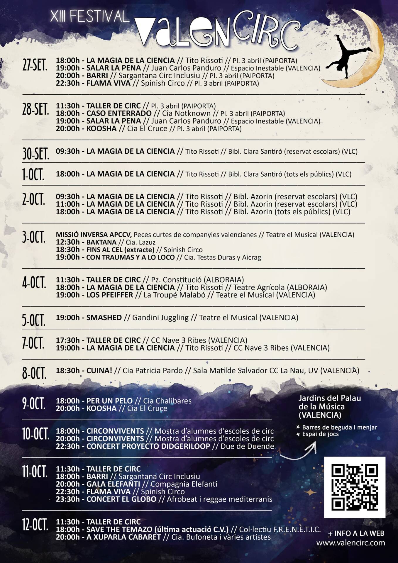 La nova edició posa en valor l’explosió creativa que viu el circ valencià, amb una gran part de la producció autòctona programada i amb moltes de les companyies locals presentant les seues obres en doble sessió. Els Jardins de Palau, el Teatre El Musical, Espacio Inestable, el Centre Cultural La Nau de la Universitat, biblioteques municipals, la Nave 3 de Ribes, a més de localitats com Paiporta i Alboraia, seran alguns dels escenaris que obriran les portes a aquesta gran festa del circ.
